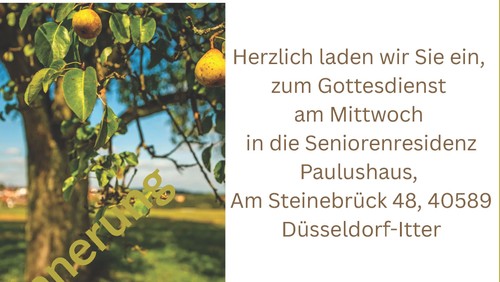 Herzlich laden wir Sie ein, zum Gottesdienst am Mittwoch in die Seniorenresidenz Paulushaus, Am Steinebrück 48, 40589 Düsseldorf-Itter.